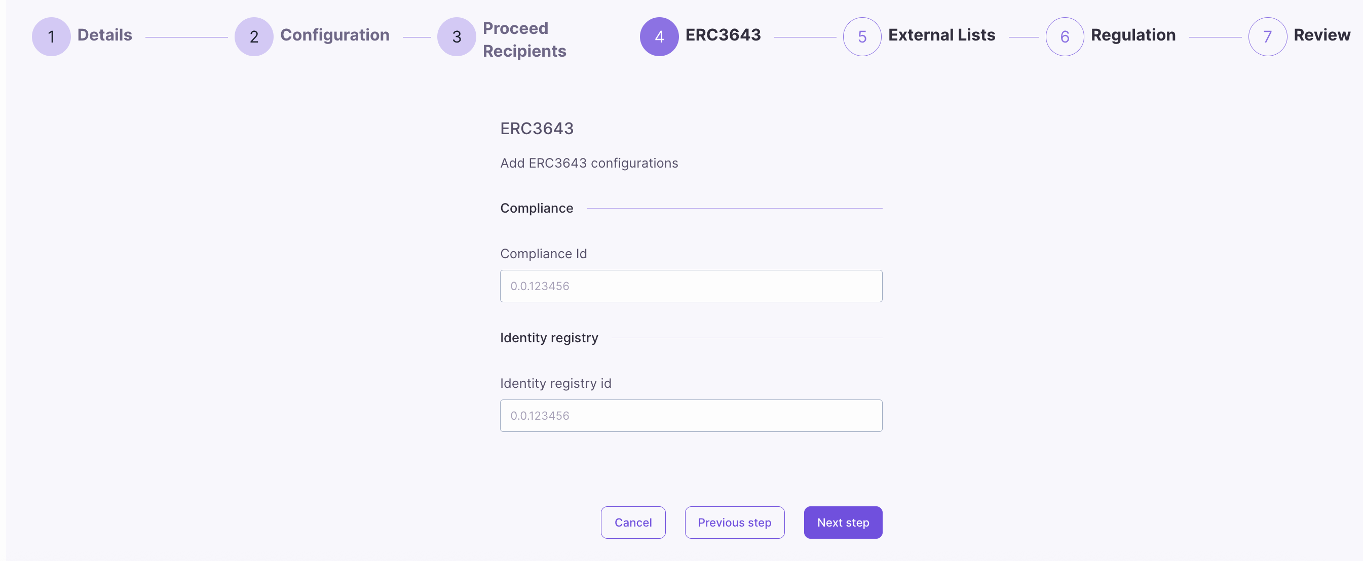 Configure ERC-3643 compliance settings for your equity. ERC-3643 is a standard for permissioned tokens that enables compliance with securities regulations through on-chain compliance rules and identity verification.- Compliance ID: The Hedera account ID of the compliance smart contract that will enforce the regulatory rules for this equity. This is optional and can be left empty if not using ERC-3643 compliance.