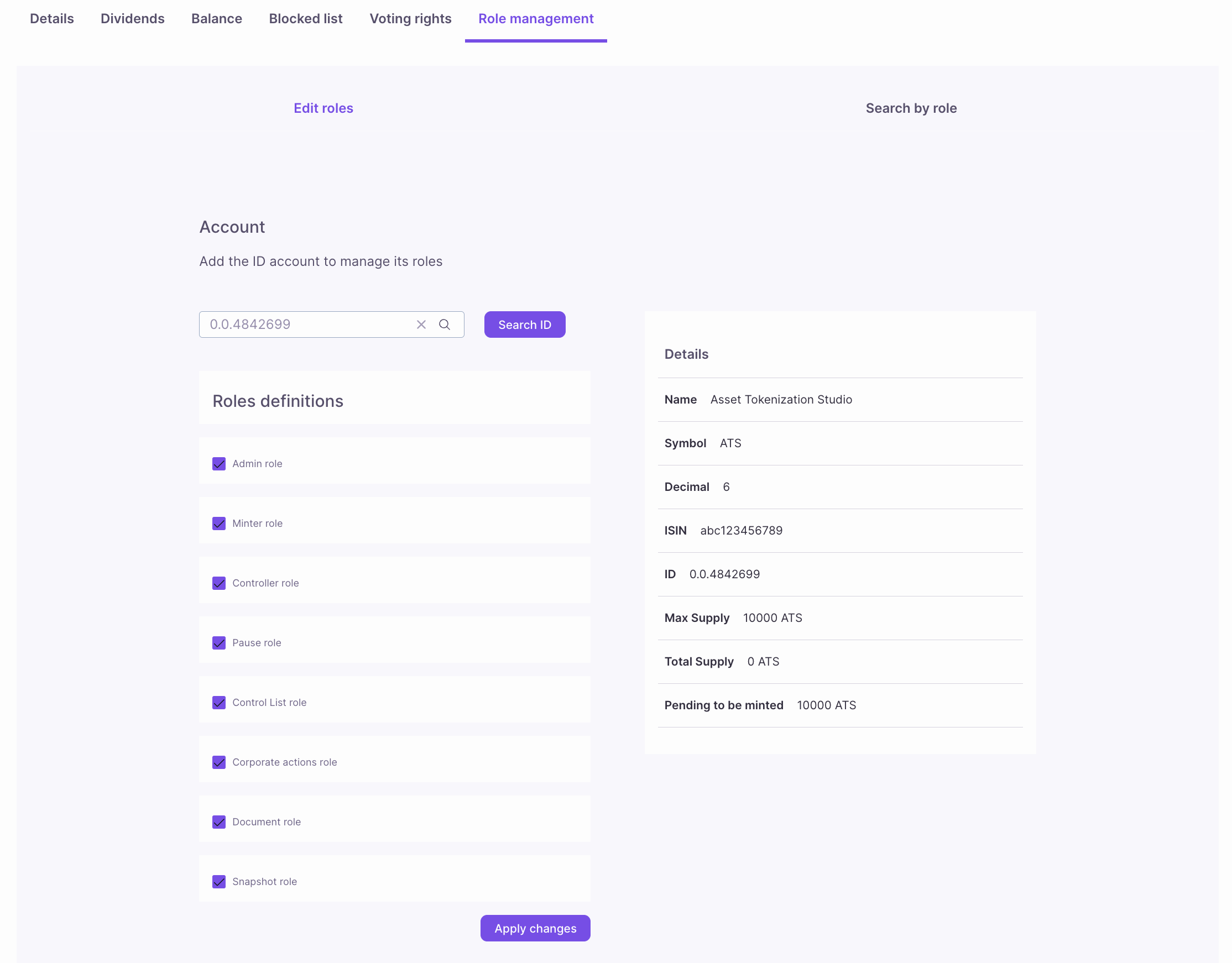 In Asset Tokenization Studio (ATS), role management is a crucial feature that provides control over various functions related to the management and operation of digital securities. If your account is assigned the Admin Role, you can manage other roles for your security tokens, making governance easier and more secure. Roles you can manage include:- Admin: Grants full administrative privileges, including the ability to assign and manage all other roles.