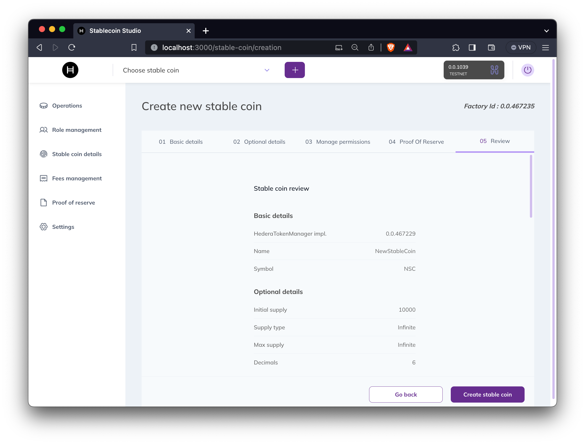 Final validation before creating the stablecoin. Review the stablecoin details and click the “Create stablecoin” button. Validate “Execute Smart Contract” and “Associate Token” transactions in your wallet. Once the stablecoin is created, it will be added to the drop-down list of coins you can access (with the account you used to create the stablecoin).