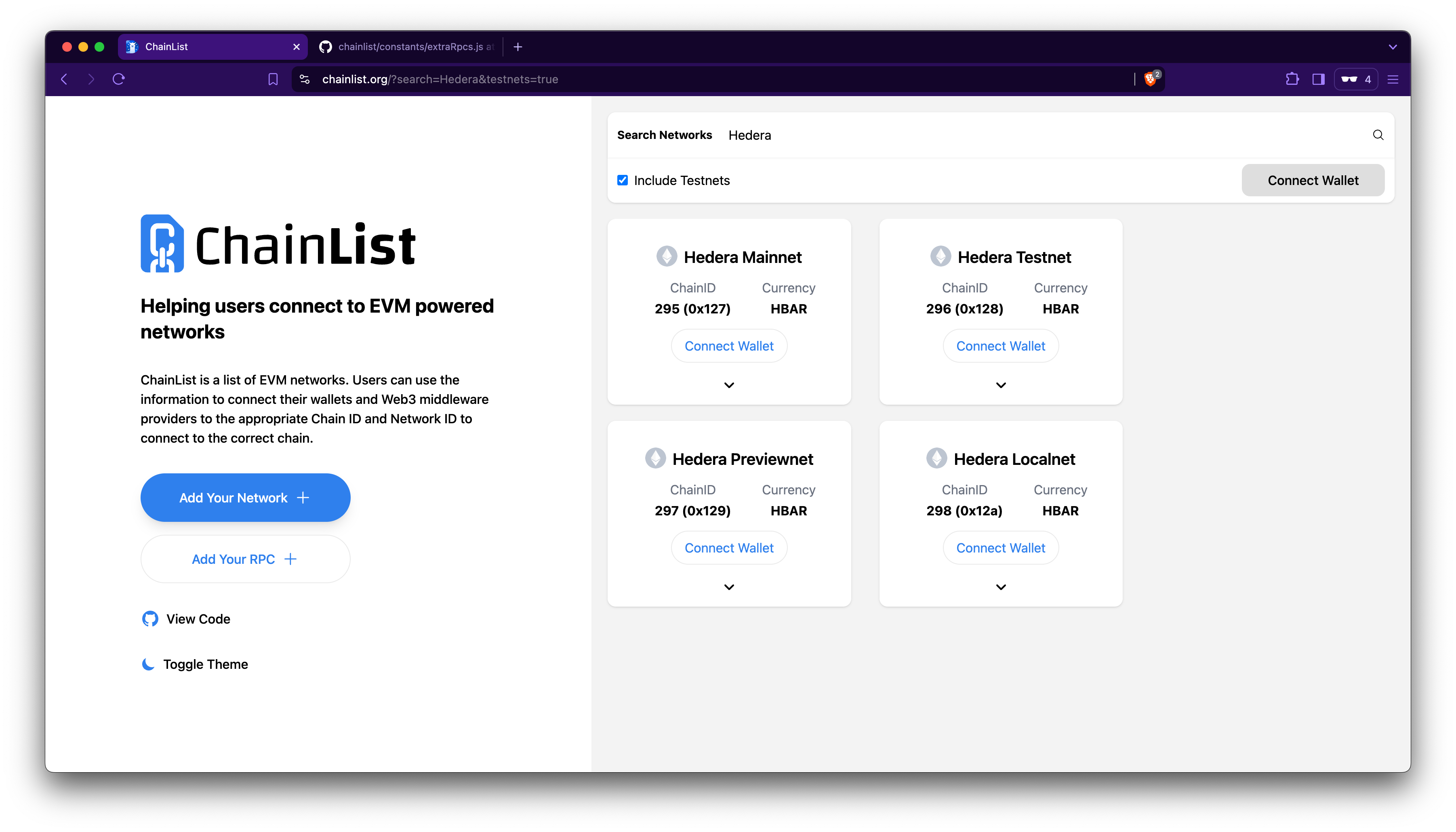 Alternatively, connect MetaMask to Hedera using ChainList:- Go to https://chainlist.org/?search=hedera.